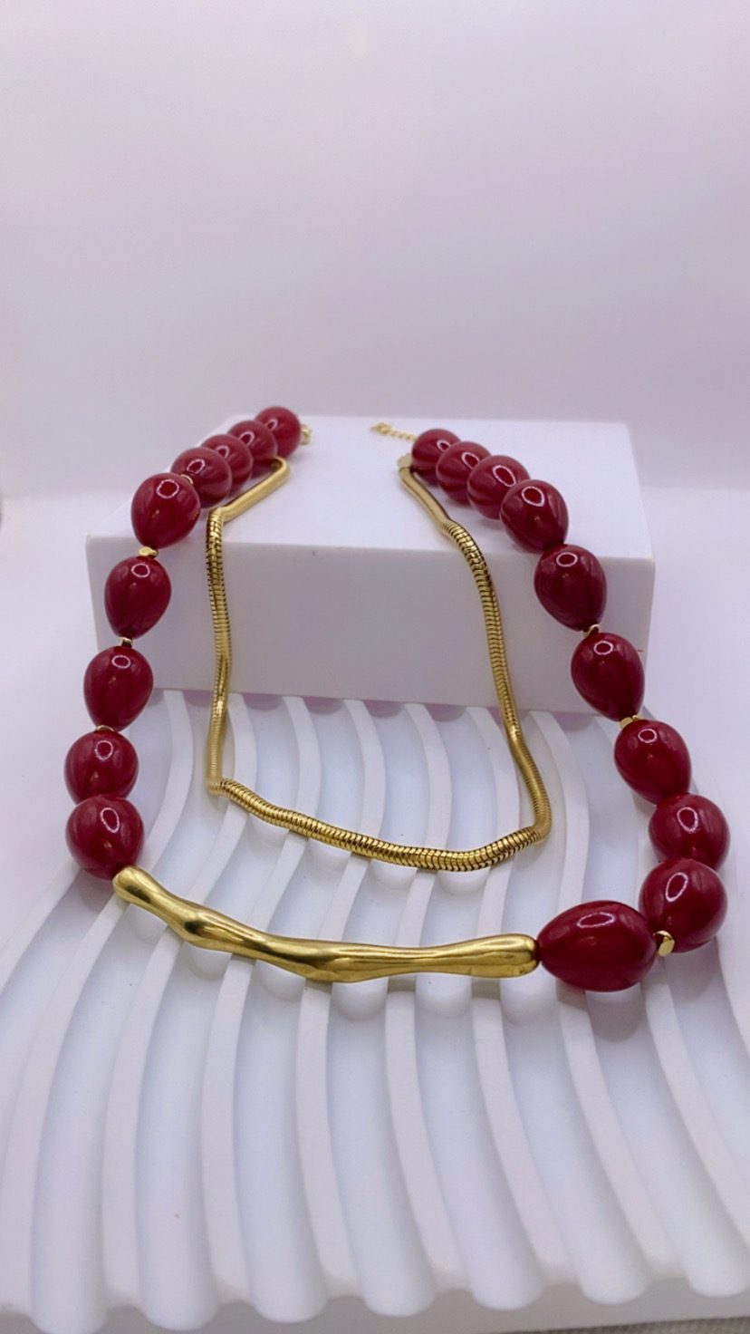 Κολιέ με ωοειδείς κρυστάλλους σε βαθύ μπορντό χρώμα που αποπνέουν κομψότητα και δυναμισμό.