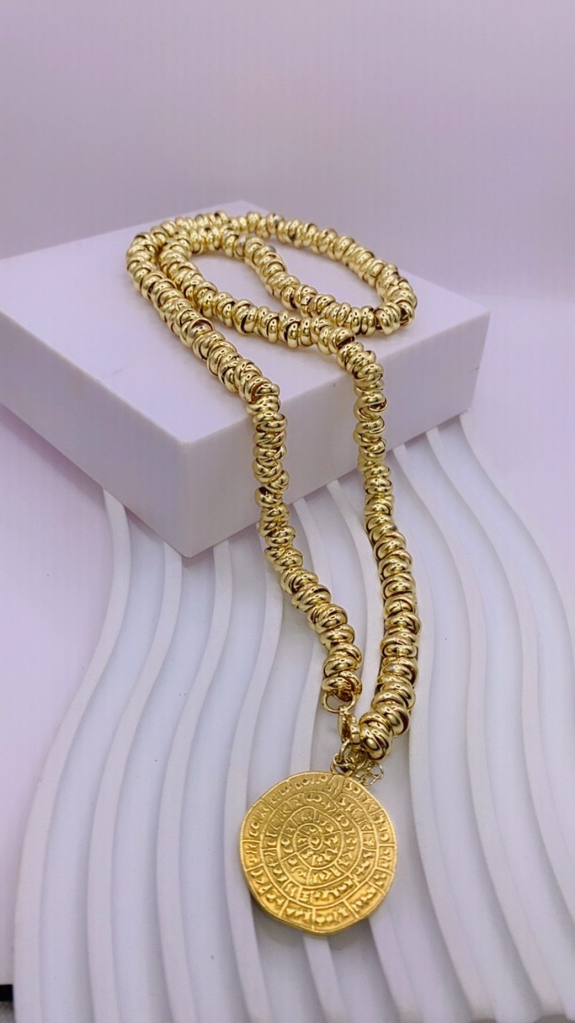 H twist αλυσίδα αγκαλιάζει ένα νόμισμα-μενταγιόν βυζαντινής έμπνευσης, αποπνέοντας δυναμισμό και κομψότητα.
