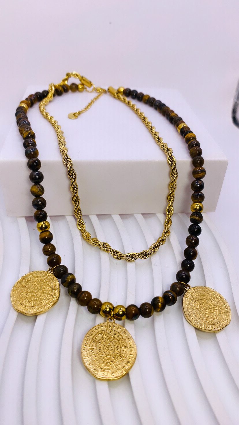 Το Tiger Coins αποπνέει δύναμη, ισορροπία και διακριτική πολυτέλεια — γιατί κάθε εμφάνιση αξίζει μια πινελιά λάμψης. 🐅💛 Ένα εντυπωσιακό διπλό κολιέ που συνδυάζει τον ημιπολύτιμο λίθο “μάτι τίγρη” με τη “rope” αλυσίδα σε μήκος 45 εκ.
