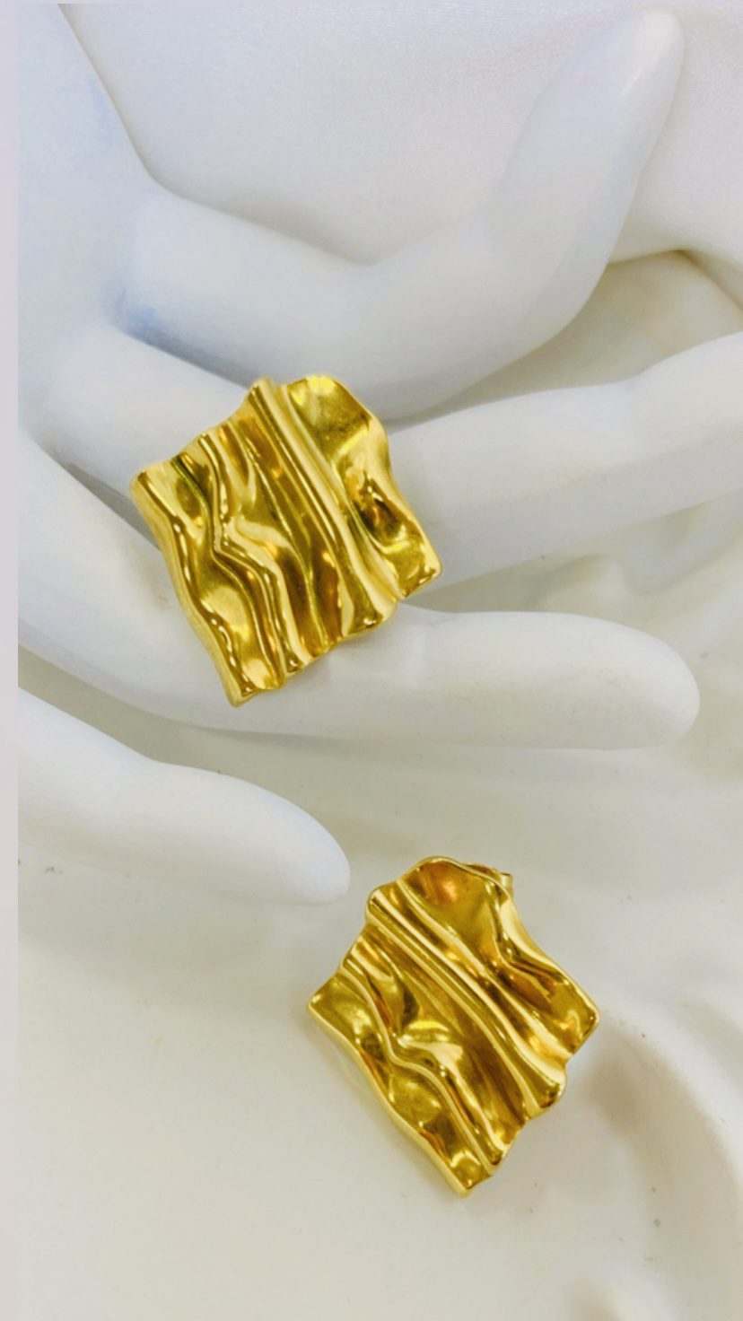 Φαντάσου: Ένα τετραγωνισμένο σκουλαρίκι, όχι απλά επίπεδο, αλλά με ένα υπέροχο κυματισμό στο σκέτο μέταλλο. Αυτός ο κυματισμός δίνει μια οργανική, σχεδόν ρευστή αίσθηση, σαν να έχει σμιλευτεί από την ίδια τη φύση. Μοιάζει με τη λάβα που ρέει απαλά, δημιουργώντας μοναδικές υφές και αντανακλάσεις. Είναι ένα σχέδιο που είναι ταυτόχρονα minimal και εντυπωσιακό, προσδίδοντας μια αίσθηση δυναμισμού και στυλ.