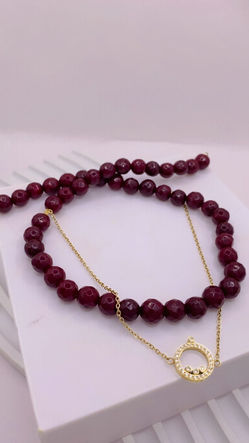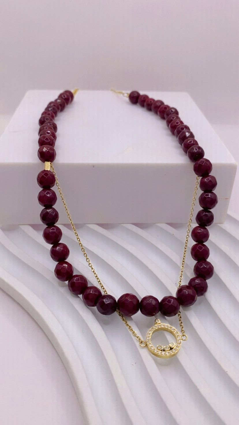 🍷 Bordeaux Glow ✨ Η ένταση του χρώματος συναντά τη λάμψη του χρυσού. Κομψό, εκλεπτυσμένο και απόλυτα θηλυκό — ένα τσόκερ που ολοκληρώνει κάθε εμφάνιση. Τσόκερ με βαθύ μπορντό κρυστάλλους και λεπτή ενσωματωμένη χρυσή αλυσίδα, που δημιουργεί έναν εκλεπτυσμένο συνδυασμό δύναμης και λάμψης. Το στοιχείο με ζιργκόν από ανοξείδωτο ατσάλι προσθέτει διακριτική πολυτέλεια, ενώ η αυξομείωση στο τελείωμα επιτρέπει ιδανική εφαρμογή. Ένα κόσμημα που απογειώνει την καθημερινή εμφάνιση με χρώμα και φως. ✨