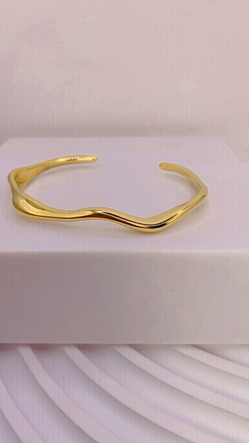 Κομψή χειροπέδα από ανοξείδωτο ατσάλι, επιχρυσωμένη 21Κ, με μοντέρνο κυματιστό σχέδιο που αγκαλιάζει τον καρπό με διακριτικότητα.
