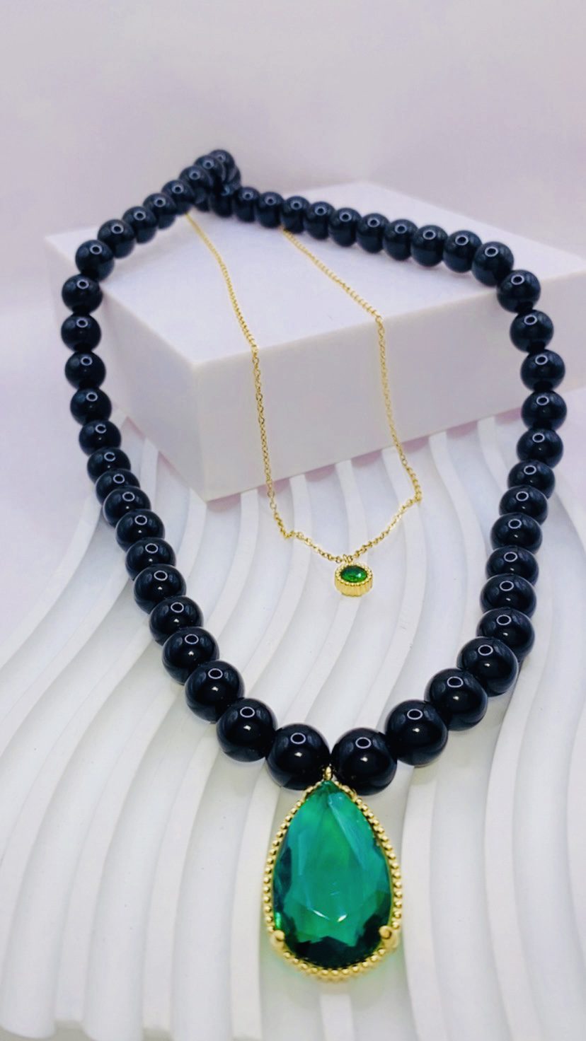 Κολιέ από ημιπολύτιμο λίθο όνυχα με έντονη λάμψη και κεντρικό κρύσταλλο σε βαθύ πράσινο χρώμα, που αποπνέει πολυτέλεια και μυστήριο.