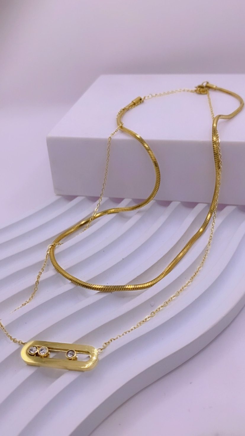 Διπλό κολιέ από ανοξείδωτο ατσάλι εξαιρετικής ποιότητας, επιχρυσωμένο 21Κ, που συνδυάζει δύο διαφορετικές αλυσίδες σε αρμονικό layering.