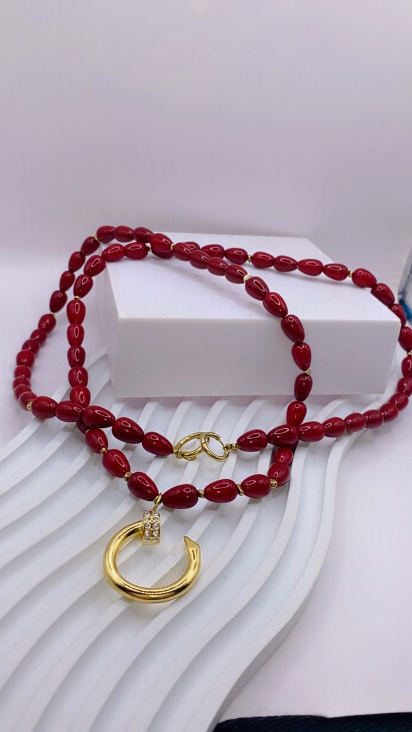 Κατασκευασμένο από φωτεινό μπορντό χαολίτη σε ωοειδές σχήμα, συνδυάζεται μοναδικά με χρυσό στοιχείο “καρφί” από ανοξείδωτο ατσάλι υψηλής ποιότητας.