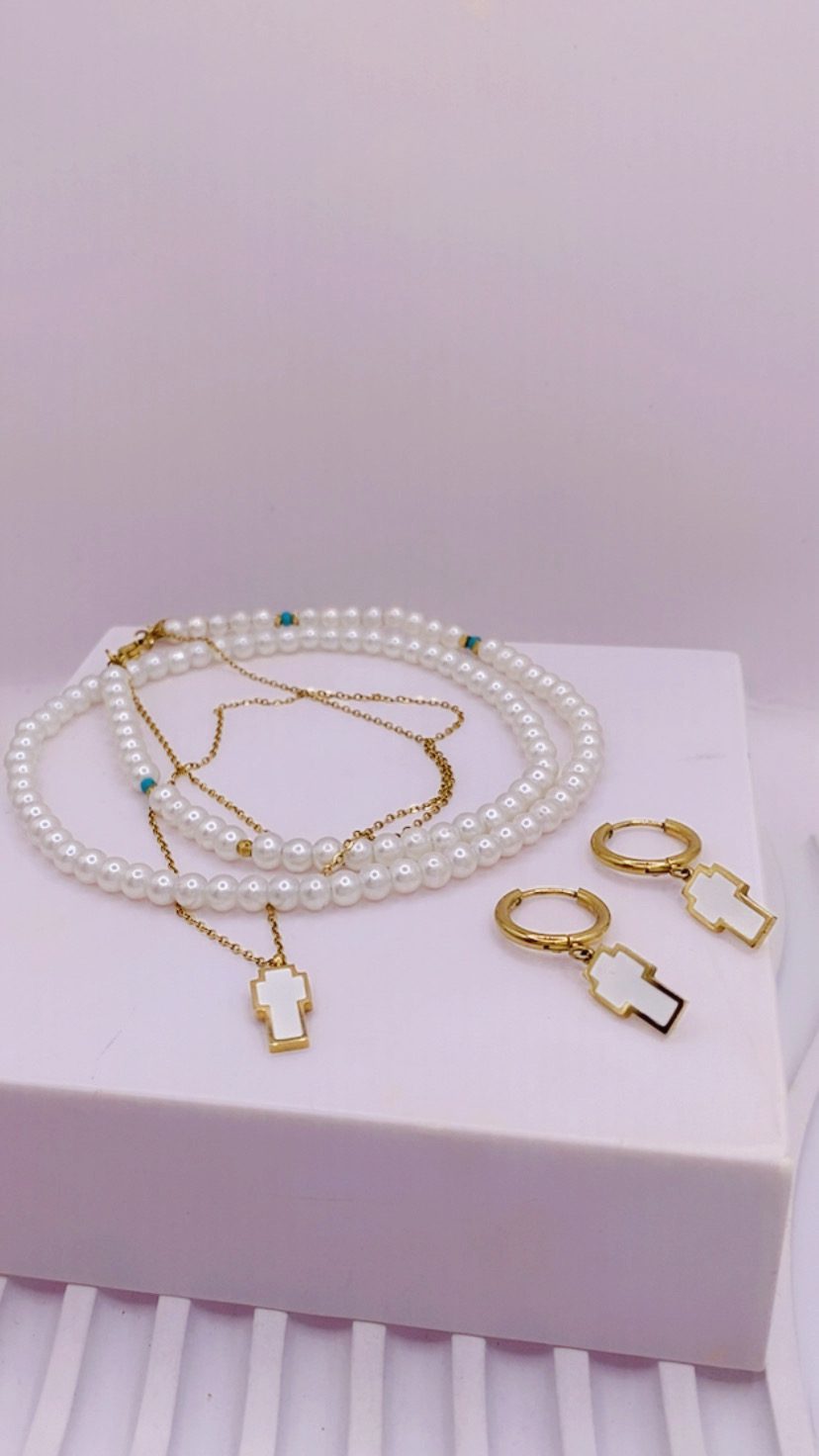 Το Pearl Cross Set συνδυάζει πέρλες και σταυρό σε σμάλτο, για εκείνες τις μέρες που θέλεις να δείχνεις chic χωρίς προσπάθεια!